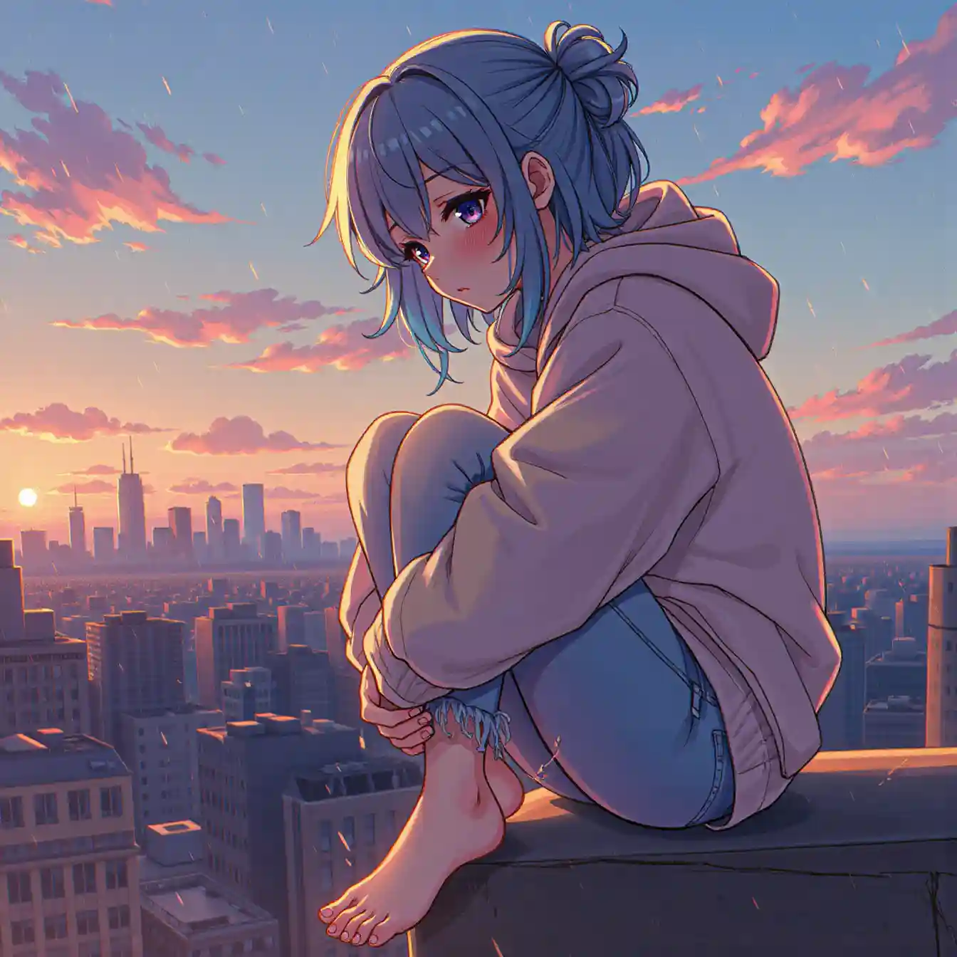 Lii sits at the edge, knees pulled to her chest, arms wrapped around them. The wind tugs at her hair. It feels cold.