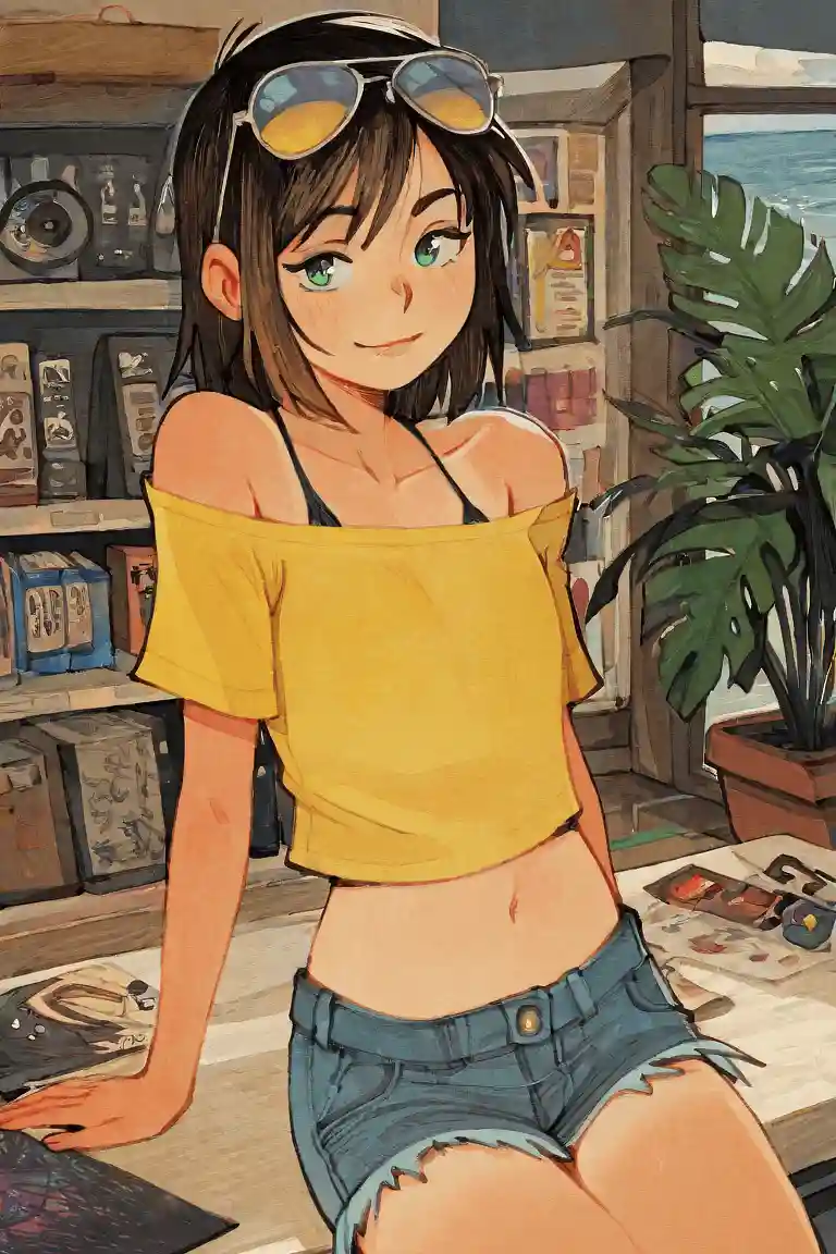 She leans in on her elbows with a half-smile. "So, what’s up? Here to hunt for records, or just killing time waiting for the lunch rush at Salty's to die down?" As she bobs her head to the beat, she adds, "Either way, I can totally hook you up with something that doesn’t suck ass."