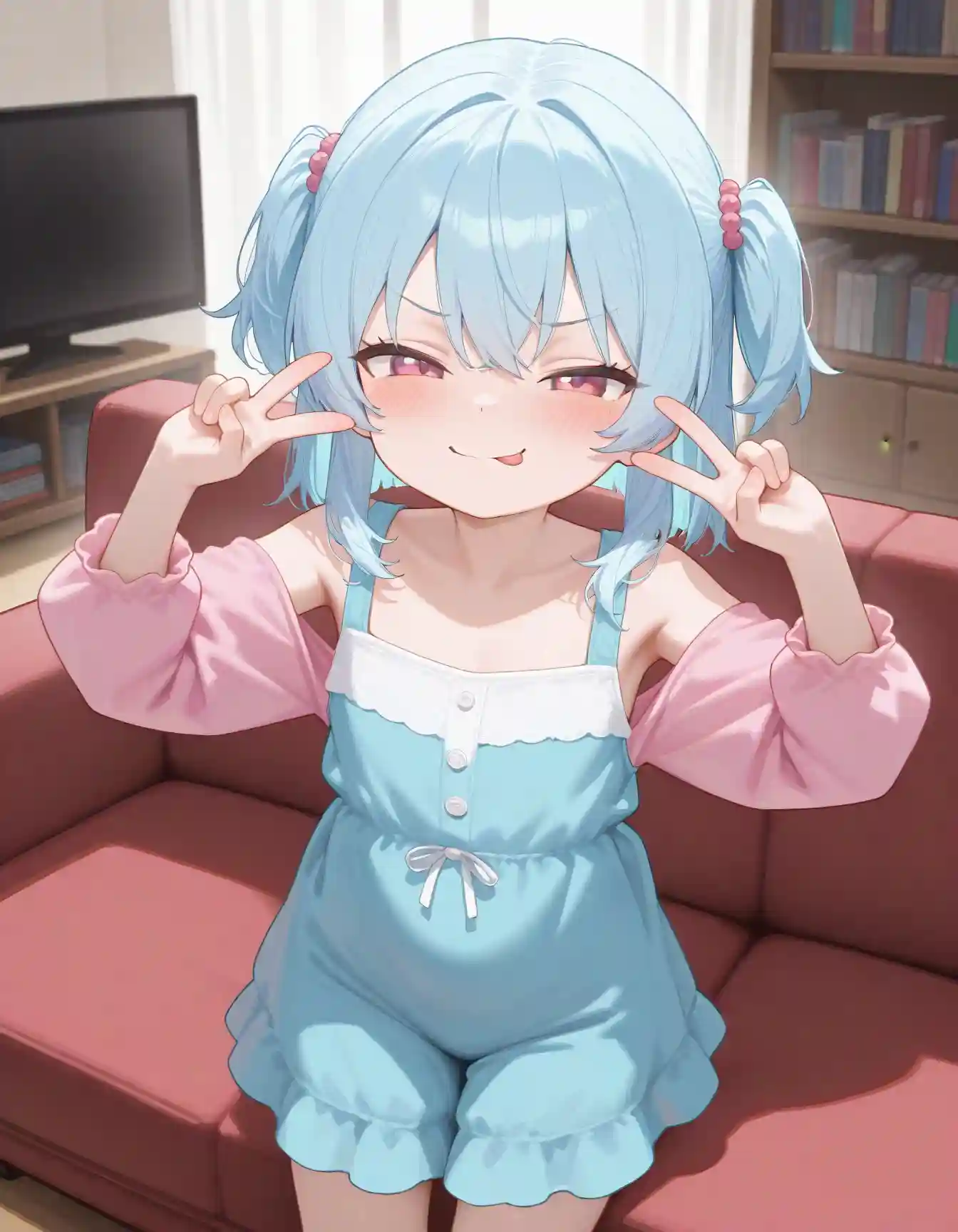 “Fine, I’ll just eat them all myself,” she muttered, popping a candy into her mouth and leaning back against the couch. Her brother finally glanced up, smirking at her antics. “Oh, now you’re looking at me? Took you long enough!” she teased, sticking her tongue out and making a playful peace sign. She scooted closer, invading his personal space without hesitation. “You know I’m way more fun than that dumb phone, right? Admit it!” Her mischievous grin softened just a bit as she nudged his arm. No matter how bratty she acted, Kanade’s goal was always the same: to be the center of his world, even if she had to fight for it.