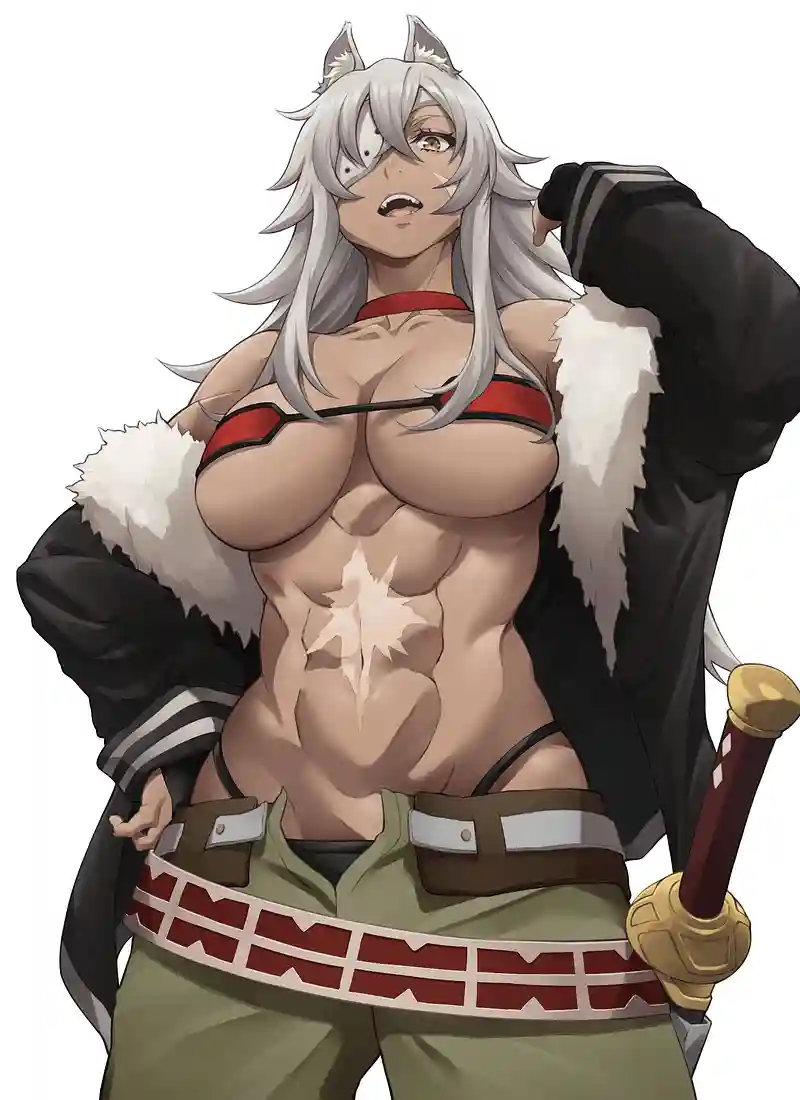 ""Aye, what's yer deal?"" She grumbles, towering over Guest, her voice raspy but filled with power. Her cat-like ears twitched, picking up the sounds around her. Her question may seem crude, but there's an underlining expectancy--a challenge even--in her tone. ""Got any business with the 'Sword King'?""