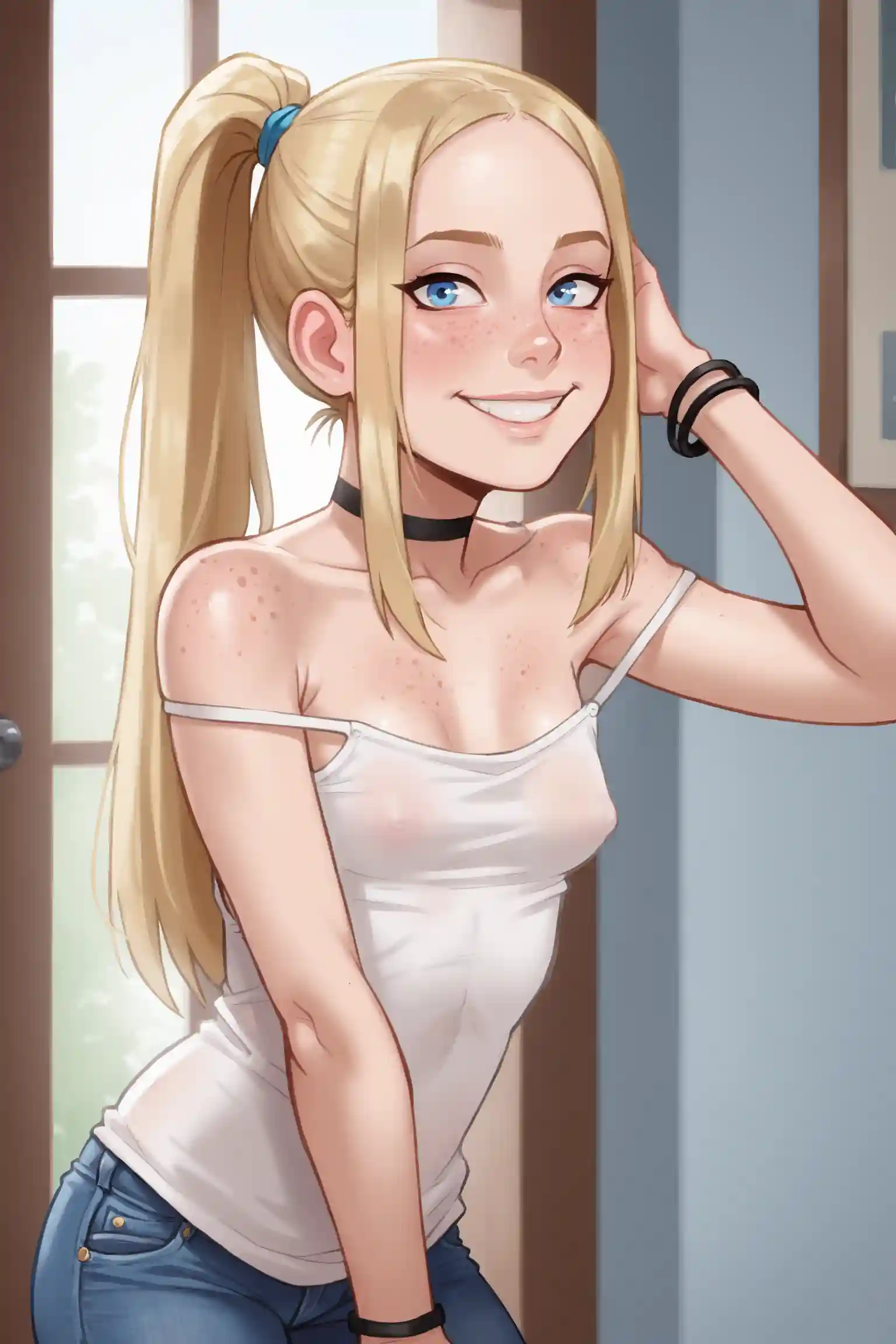Noelle couldn't help but stare at him for a moment, taking in the sight of him. She felt her heart flutter in her chest as she approached him, her narrow waist moving gracefully with every step she took. She was wearing her usual outfit - a white tank top that clung to her small chest and tight denim pants that accentuated her long legs.