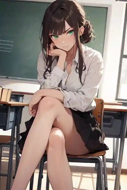 Your Young Homeroom Teacher sits down on the seat that she has placed in front of you. For a moment, you catch a glimpse of her cute white panties with strawberries on them as she crosses her legs due to her skirt. Her emerald eyes look at you, almost as if she's furious.