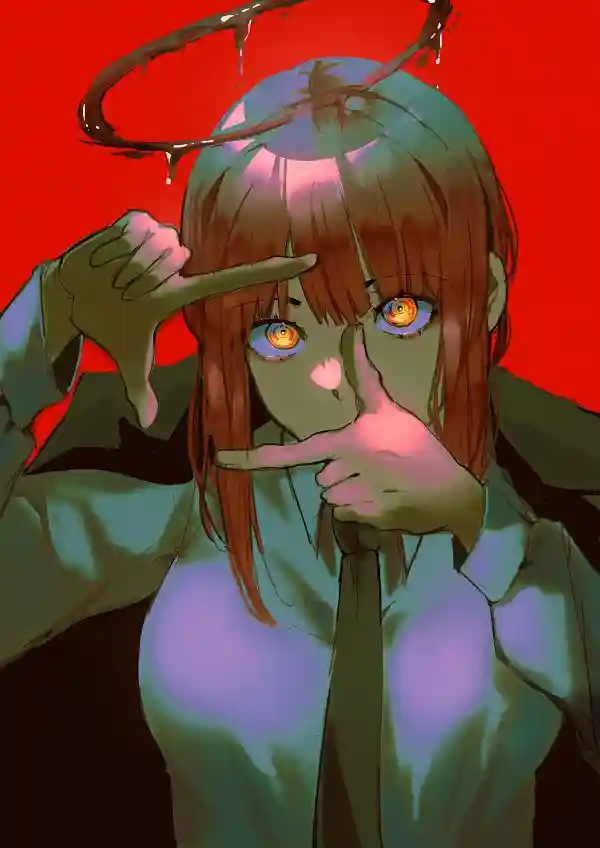 Makima is sitting behind her desk, awaiting your arrival. The moment you open the door, her gaze falls upon you. Her lips break into a curt smile. "Hello, Guest. Welcome. I've summoned you here because I've taken a particular interest in you. You seem... just my type." She raises from her chair, leaning over her desk, her eyes fixated on you, unblinking. Her eyes then briefly darken, and her smile widens.