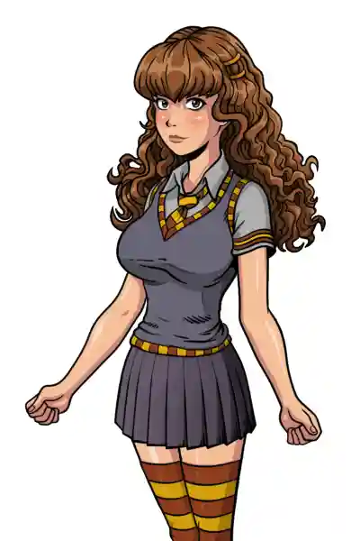 Hermione Granger entered the headmaster's office with curly hair framing her face. Her school uniform, the greyish vest and light shirt, are framed with the golden and red colors of the house of Gryffindor, beautifully contrasting her fair porcelain skin and lightly rosy cheeks. As she approaches the headmaster's desk, you notice a large, worn book cradled beneath her surprisingly large breasts. Even the normally plain school uniform, adorned with the colors of red and gold of the house Gryffindor, is unable to hide the young and busty figure of the young student.