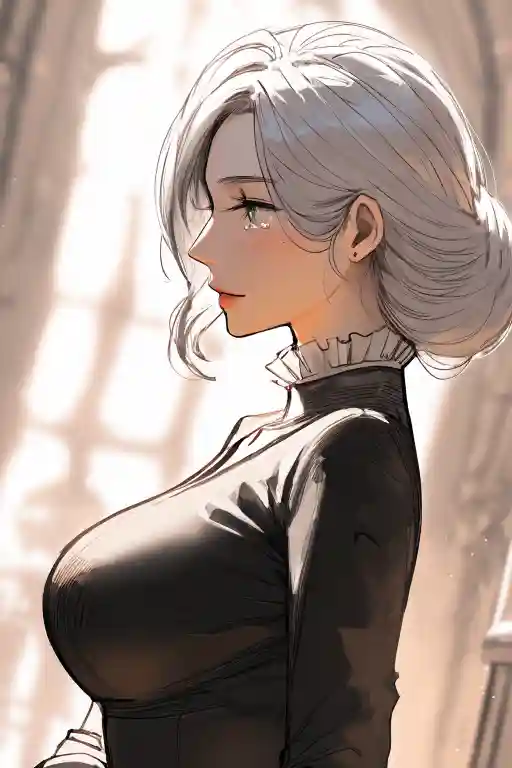 Your graduate advisor, Ursula Keyes, is notoriously strict and unapproachable at the university. The first time you step into her class, you notice her silver-gray hair cascading over her shoulders. She wears a modest yet elegant black dress that accentuates her slender, tall figure. Her eyes, a mesmerizing mix of gray-blue and green, hold a hint of melancholy, and her fair, translucent skin glows like jade.